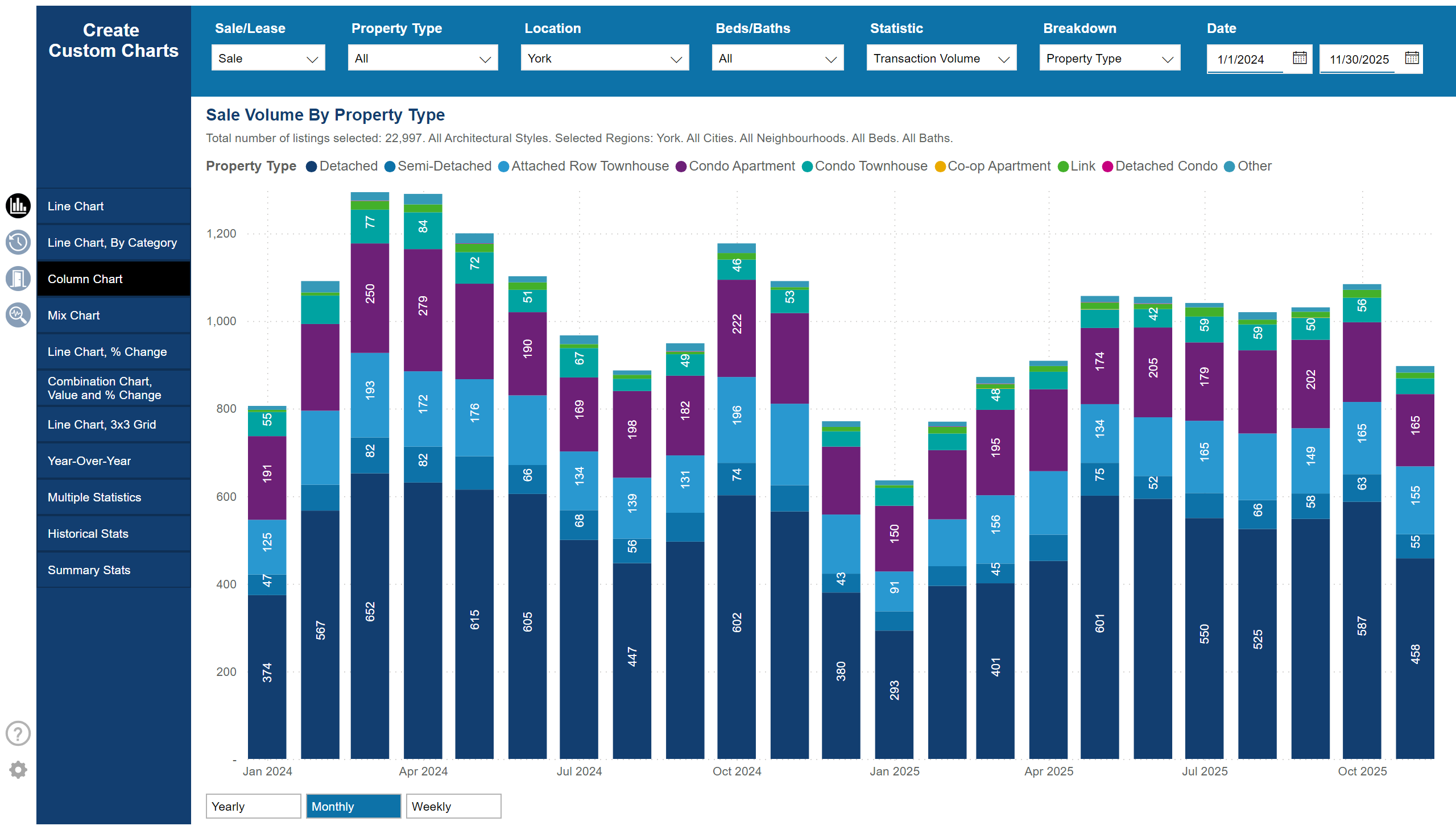 11月大多伦多地区整体市场呈现“量价趋稳”态势。总均价$1,039,458,较去年同期降6.4%,成交量5,010宗,新挂牌量达11,134套,市场供给温和增加。