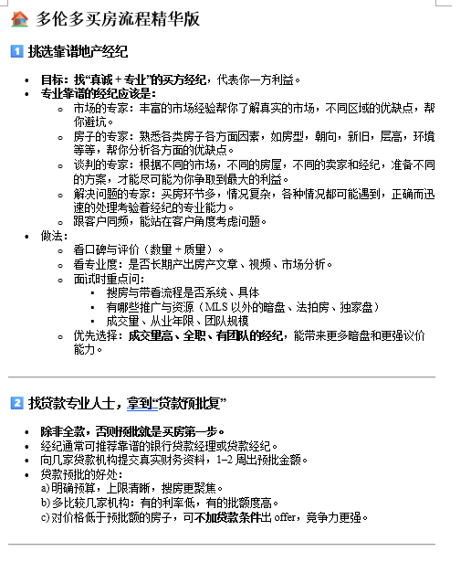 ✅买房流程整理: 1. 准备首付款 准备房屋总价的 20%-35% 作为首付款。 2. 寻找贷款经纪人 确定贷款金额范围及利率,明确预算。 3. 选择房产经纪人 告知经纪人你的买房计划,根据需求和预算推荐合适房源。 4. 确定区域与房型 详细说明需求(如学区、交通、环境等),帮助经纪人筛选房源。 5. 挑选房源并看房 重点查看房屋周边环境及屋顶、地板等硬装是否存在问题。 6. 锁定目标房源并下Offer 确认卖家是否收到其他Offer及理想的交房日期后提交报价。 7. Offer谈判及支付定金 买卖双方谈判达成一致后,买家需在规定时间内支付定金(一般为房价的5%)。 8. 验房 检查水电、暖气空调、墙面等是否存在问题,如有维修需求可与卖家协商(装修风格问题不影响验房通过)。 9. 申请正式贷款 提交房屋合同和成交价格等信息至贷款机构完成贷款申请。 10. 购买房屋保险及交接 购买火险等房屋保险,确保交房当日生效;交房后开通水电账户,从交接日起开始计费。 这样整理可以帮助您更清晰地了解买房流程。