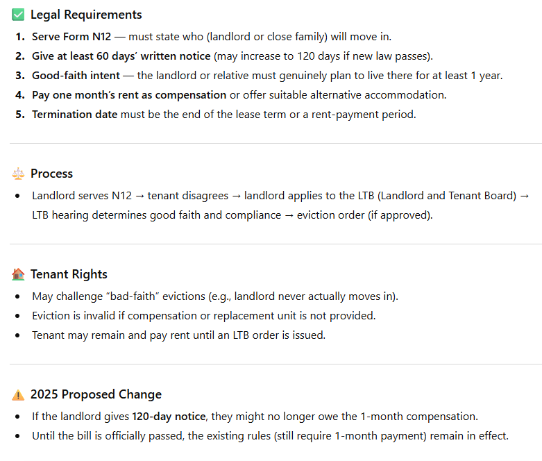 发出 N12 → 租客不同意 → 房东向 LTB 申请听证 → LTB 审核是否善意与合规 → 批准或拒绝驱逐。